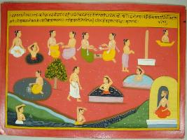 | Description / विवरण | Miniature painting based on Mahabharat - Vana parva depicting Shukracharya is telling about different tirths at lower left part. Karmaye tirth near confluence of Gomati and Ganga river is depicted with men taking bath at lower level. Ganga is depicted at upper right part. A man is shown worshipping foot print. Behind him, there is Kashayap tree. At the upper right part man is shown performing Pind daan, next tirth, man should go to Brahamsari. After completing these tirth he would go to swarg. |