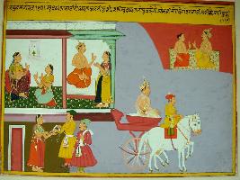 | Description / विवरण | Miniature painting based on Raghuvansha. A king talking to females in their compartments. Two men are giving gifts to a woman in the right side. In the right side Indra is depicted talking to a sage and just below that a king is depicted riding a chariot drawn by two horses. |
