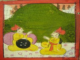 | Description / विवरण | Leaf from illustrated manuscript of Dhola Maru depicting Pingle sitting with king Nal. king Nal is praying to him. This manuscript has 111 pages with 35 illustrations. |