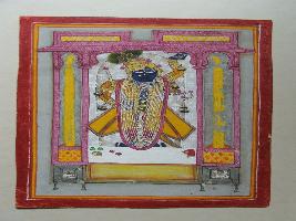 | Description / विवरण | It is a painting in which blue body god Srinathji is shown holding a flute and wearing a feathered crown. A check-pattern costume, white garland and yellow background is remarkable. |