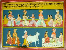 | Description / विवरण | Miniature painting based on Harivansha depicting on above part a person sitting with children and in the below part one couple walking, a Brahman with cow and a man sitting with wife and son. It is an incomplete painting. |