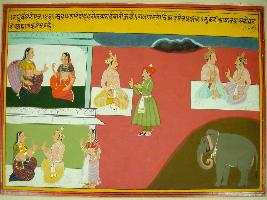 | Description / विवरण | Miniature painting based on Raghuvansha depicting a seated queen talking to a female, outside her compartment, the king is talking to a man. In the lower right side, the king and queen are talking together. In the left side two kings are sitting and talking together. Below them an elephant is standing in the bottom left corner. |