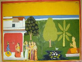 | Description / विवरण | Miniature painting based on Krishna charitra - Sur Sagar depicting Gopis coming to Krishna for help. One of them is shown sitting with Krishna in his house at extreme right part. At the left part, Surdas is shown sitting and playing Manjeera. |