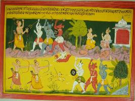 | Description / विवरण | Miniature painting based on Mahabharat - Vana parva depicting Bhim is fighting with demons on his way to Kailash and a Yaksha describing the war in front of Kuber. |