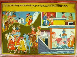 | Description / विवरण | Miniature painting based on Harivansha depicting on the left above depiction of Krishna with his ministers, on the right above, a person talking with lady in below part Krishna talking with two ministers and in the last scene Krishna leave with both the man towards Vindhyanchal mountains. It is incomplete painting. |