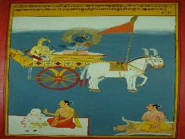 | Description / विवरण | Miniature painting based on Shri Bhagwat Gita. It depicts Krishna preaching Arjun that those people who are attracted to god and have faith in him, they are brainy. By doing meditation no one gains knowledge. |