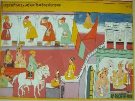 | Description / विवरण | Miniature painting based on Raghuvansha depicting the arrival of a king and queen, sitting in a chariot, in Ayodhya and people are welcoming them. |