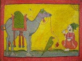 | Description / विवरण | Leaf from illustrated manuscript of Dhola Maru depicting Dhola sitting and cleaning his teeth with his camel standing and facing left. A parrot is shown in between Dhola and camel. This Manuscript has 111 pages with 35 illustrations. |