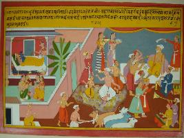 | Description / विवरण | Miniature painting based on Krishna charitra - Sur Sagar depicting Rag Malhar, Ragini of Rag Megh depicting the arrival of in front Krishna to Nand s home, and everybody is dancing in celebrations. |