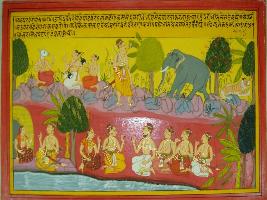 | Description / विवरण | Miniature painting based on Mahabharat - Vana parva depicting Draupadi is talking to Bhim and ask him to go to Kailash mountain and meet Shiv. After that Bhim went to Kailash and on the way he meet many elephants and tigers. At the upper right Narad is seen talking to a donkey headed man. |
