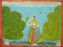 | Description / विवरण | Leaf from illustrated manuscript of Dhola Maru depicting a parrot coming to Marwani who is walking in garden and giving the news of Dhola coming. This manuscript has 111 pages with 35 illustrations. |