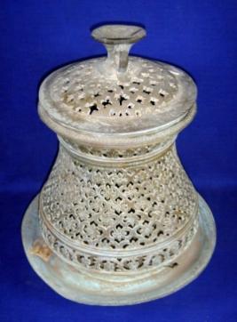 | Description / विवरण | Lamp with a lid kept on a circular platform and having floral jali designs all over. It is a lamp of Persian style. |
