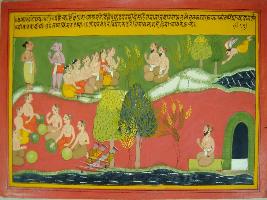 | Description / विवरण | Miniature painting based on Mahabharat - Vana parva depicting Pandavas are eating fruits in the hermitage of sage Astrisan and talking to two sages. At the upper left Garuda is depicted catching a snake. |