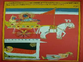 | Description / विवरण | Miniature painting based on Shri Bhagwat Gita. It depicts Krishna preaching Arjun that no one should greed for their body, after soul go out from it has no use. |