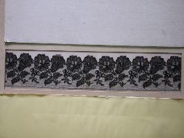 | Description / विवरण | This is a Nottingham machine made black silk chantilly lace. Flower and leaves pattern is depicted on a thin net. One edge is straight and the other edge is wavy. |