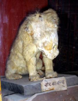 | Description / विवरण | Specimen of a small lion cub sitting on a pedestal with its face down. It is preserved with taxidermy technique. |