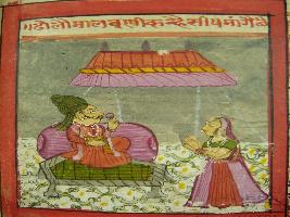 | Description / विवरण | Leaf from illustrated manuscript of Dhola Maru depicting Dhola sitting on couch with flower in his one hand and look at Marwani who is standing nearby. She is asking blessing from her. This manuscript has 111 pages with 35 illustrations. |