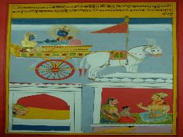 | Description / विवरण | Miniature painting based on Shri Bhagwat Gita. It depicts Krishna preaching Arjun people should not fear for death as it is destined for everyone one day. |