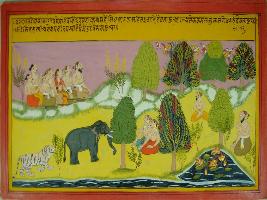 | Description / विवरण | Miniature painting based on Mahabharat - Vana parva depicting Pandavas reaching the hermitage of Purukh sage and many elephants, lions, sages are coming to see them. |
