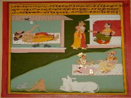 | Description / विवरण | Miniature painting based on Panchtantra depicting two sages sleeping on same bed. Then they asked each other about their pilgrimage. Then they moved towards river bank and discussed about a rat. |