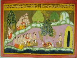 | Description / विवरण | Miniature painting based on Mahabharat - Vana parva depicting that on the eighth day of the exile Pandavas reached the hermitage of sage Brashparva and opened the bundle of utensils and arms. After that sage Brashparva shows Pandavas the way they have to go and come back. |