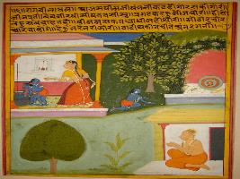 | Description / विवरण | Miniature painting based on Krishna charit - Sur Sagar depicting Rag Bilawal, the ragini of Rag Hindol on the painting it depicts the childhood days of Krishna. Yashoda is also seen while Surdas is seen in the lower left corner in Anjalihasta mudra. |
