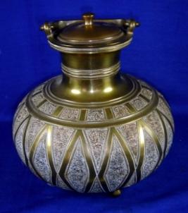 | Description / विवरण | Brass lota having lid with knob, handle, averted rim, narrow neck, round body and four stands. On the body it has incised floral and geometrical designs. |