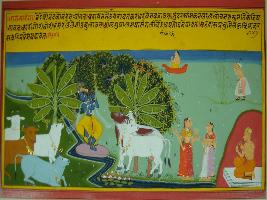 | Description / विवरण | Miniature painting based on Krishna charit - Sur Sagar depicting Rag Saranga, son of Rag Megh. Surdas is shown sitting and playing Manjeera at lower left part. He is narrating scene. To his right, two gwalins are shown standing and talking about the magic of Krishna s flute playing. At the left, Krishna is playing flute near bank of Yamuna. Cows are shown listening the flute of Krishna. A god is depicted sitting on Vayuyaan at upper part. |