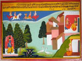 | Description / विवरण | Miniature painting based on Krishna charit - Sur Sagar depicting Rag Natanarayana the son of Rag Deepak. On the painting Krishna is seen that sitting on the garden and Radha is talking with her friend while Surya and Indra is seen in the top of the painting. Surdas is seen in the lower part playing Manjeera. |