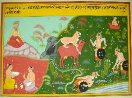 | Description / विवरण | Miniature painting based on Raghuvansha depicting a king standing in front of Kamdhenu and a lion standing on Kamdhenu. The king asks lion to leave it and offers his body for eating. The lion asks for proof and the king withdraws his weapons and lay on the ground. |