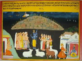 | Description / विवरण | Miniature painting based on Krishna charitra - Sur Sagar depicting Rag Malhar the Ragini of Rag Megh. On the painting is the scene of Krishna Govardhan lifting is depicted while Indra is seen on the top. |
