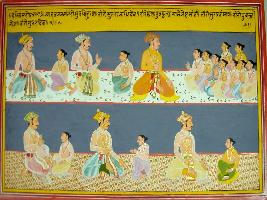 | Description / विवरण | Miniature painting based on Harivansha depicting six kings sitting and talking with their sons in two rows. |