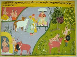 | Description / विवरण | Miniature painting based on Raghuvansha depicting tiger sitting over cow and talking to a king, at its left part. To its lower left, king saved the cow and take to the ashram of Rishi. At the upper middle part, king is shown sitting in his throne and two men standing with cows. At the upper right, Indra is shown with two gandharvas. |
