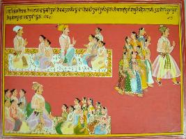 | Description / विवरण | Miniature painting based on Harivansha depicting kings talking with their sons and daughters. A king is shown walking with his daughters in the left part. |