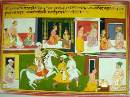 | Description / विवरण | Miniature painting based on Harivansha depicting a king sitting with his son and daughter, a marriage ceremony, a man giving donation to a Brahman, a couple with their child in the upper portion. In the lower row an old man is sitting sadly, a king riding on horse with two other people and at the extreme left bottom corner a Brahman is performing yagna. |