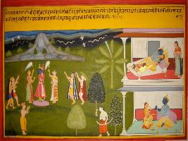 | Description / विवरण | Miniature painting based on Krishna charit - Sur Sagar depicting Rag Malhar ragini of Rag Magh. In right part, Krishna is depicted raising Govardhan hill and in left part, his loving union with Radha is depicted. |