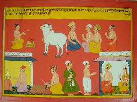 | Description / विवरण | Miniature painting based on Mahabharat - Vana parva. It depicts Yudhisthir says that by insulting fire, bull, guest, son and servant, we will loose and destroy our inner self and goodwill. It is same as a sin of killing an animal. |