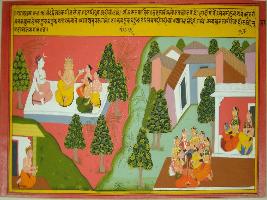 | Description / विवरण | Miniature painting based on Krishna charit - Sur Sagar depicting Rag Aasawari. At the upper right Brahma and Shiv are in conversation. At the left side child Krishna is depicted in the lap of Yashoda. in front of the house Gopis are celebrating Krishna s birth. |