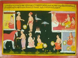 | Description / विवरण | Miniature painting based on Mahabharat - Vana parva depicting is telling that food can never for Ashava horse chamar and bird. They are shown eating food at the left part. At the right part people are shown taking food at both upper and lower part. |