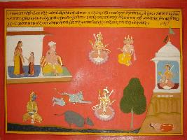 | Description / विवरण | Miniature painting based on Mahabharat - Bhishma parva depicting Sanjay is telling Dhritrashtra when Krishna saw the Pandavi army he ask Arjun to pray Bhavani. Arjun start worshipping Bhavani by calling her Kumari, Kali, Kapila, who has Brahma vidya, who is mother of Kartikeya and killed Mahisasura. |