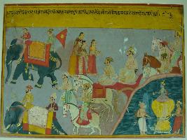 | Description / विवरण | Miniature painting based on Raghuvansha depicting seated on the chariot, guided by the elephants. The king is going for Digavijaya, while on the lower left corner, a scene of Samudra manthan is depicted. |