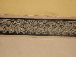 | Description / विवरण | This is a Nottingham machine made imitation cotton coloured lace. Two types of pattern is depicted. The top part is having beetle leaf pattern, the central and the lower part is floral and geometrical pattern. The upper part is straight and the lower part is wavy line. |