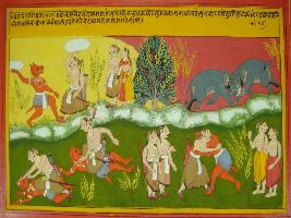 | Description / विवरण | Miniature painting based on Mahabharat - Vana parva depicting the fighting scene of Bhim and Rakshasa. While other Pandavas including Draupadi are watching the fighting. The fighting is compared with the fighting of elephants, who threw big stones on each other. |