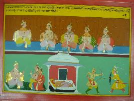 | Description / विवरण | Miniature painting based on Mahabharat - Bhishma parva. The painting depicts Bhishma and some other king like Jayati, Narash and says that the king who fights for dharma get place at heaven. |