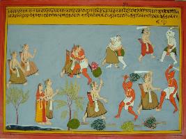 | Description / विवरण | Miniature painting based on Mahabharat - Vana parva depicting a fighting seen of Bhim and a Rakshasa and Yudhisthir, Nakul, Sahdev and Draupadi watching them. The fighting is compared with the fighting of Devtas and demons and it lasted for many months. |