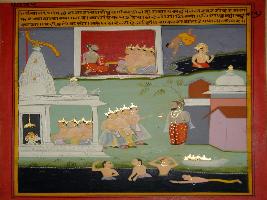 | Description / विवरण | Miniature painting based on Panchtantra depicting four princes reaches Shipra river and worship Shiv. After that they meet Bhairavanand yogi who asked them where they are going. Then the princes replied that they are going in search for wealth, then suddenly they fall into hell. |