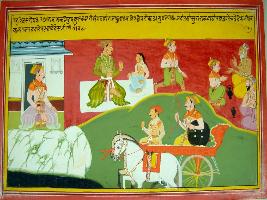 | Description / विवरण | Miniature painting based on Harivansha. A king sitting alone in the left often that king sitting with his son in the right king Rukmeshu taking blessing from the sages and go far this country victory mission. It is incomplete painting. |