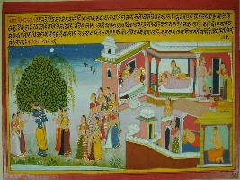| Description / विवरण | Miniature painting based on Krishna charitra - Sur Sagar depicting Rag Bilawal. The painting depict Krishna playing flute and Gopis are coming out of their houses to meet Krishna after their husbands fall asleep. |