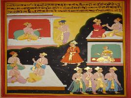 | Description / विवरण | Miniature painting based on Panchtantra depicting due to bad work one may looses his friend and brothers. It also depict four princes going in search of wealth. |