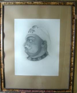 | Description / विवरण | Glass framed black and white print of Maharaja Baden Singh who ruled from 1722 to1755. He is facing right having moustaches and wearing a turban. |